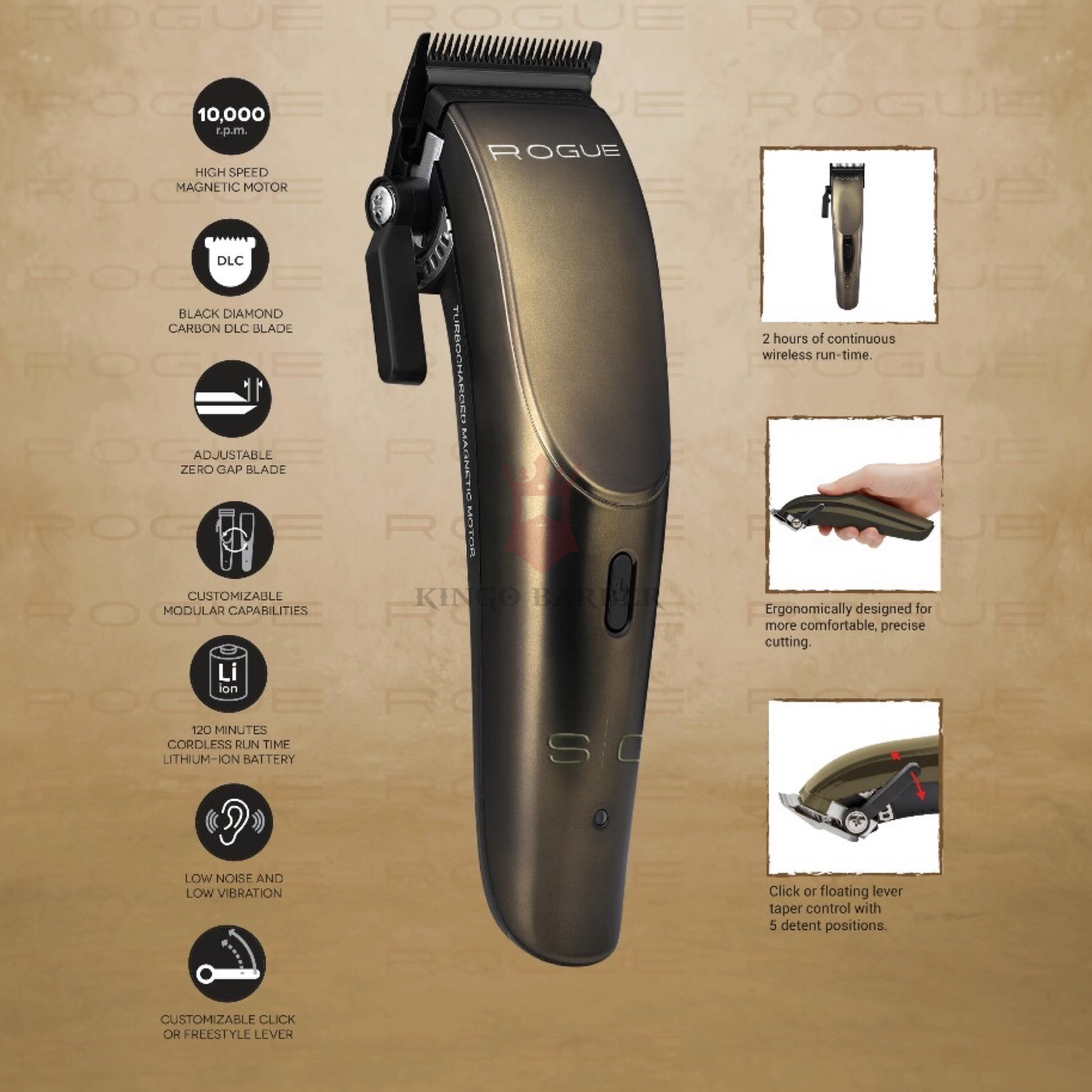 Diseñado para estar perfectamente equilibrado en su mano, el Rogue presenta un clic cónico para obtener los resultados más consistentes. La hoja totalmente ajustable se puede ajustar fácilmente a cero para lograr el corte y el acabado más precisos. La hoja Black Diamond Carbon DLC de la más alta calidad se mantiene más fresca, libre de óxido y más afilada por más tiempo. Con una palanca de clic cónica y una batería de iones de litio con 120 minutos de funcionamiento, se ha establecido un nuevo estándar.