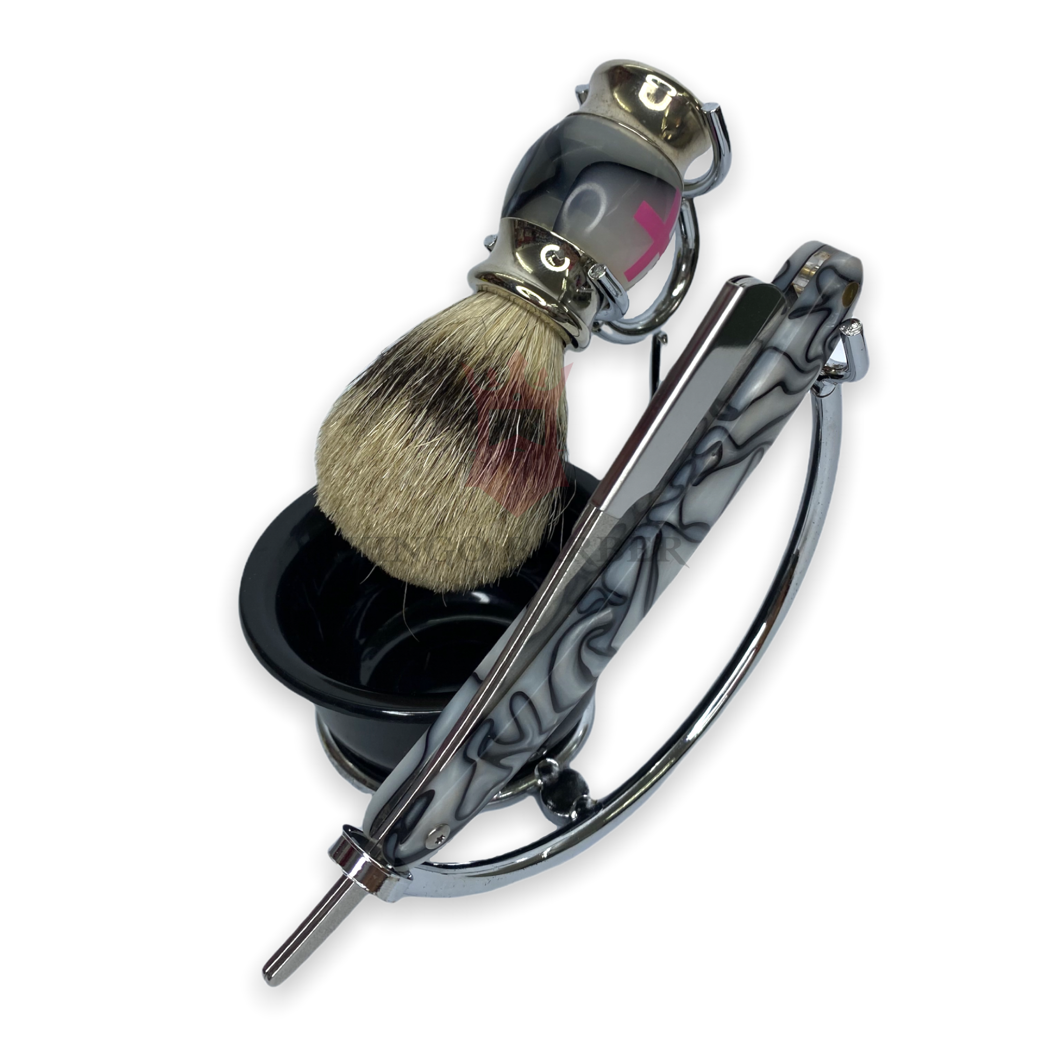 Kit de afeitado profesional. Contiene una navaja para un rasurado preciso, una brocha ergonómica que le aporta confort y una vasija indispensable para aplicar espuma o gel de afeitar