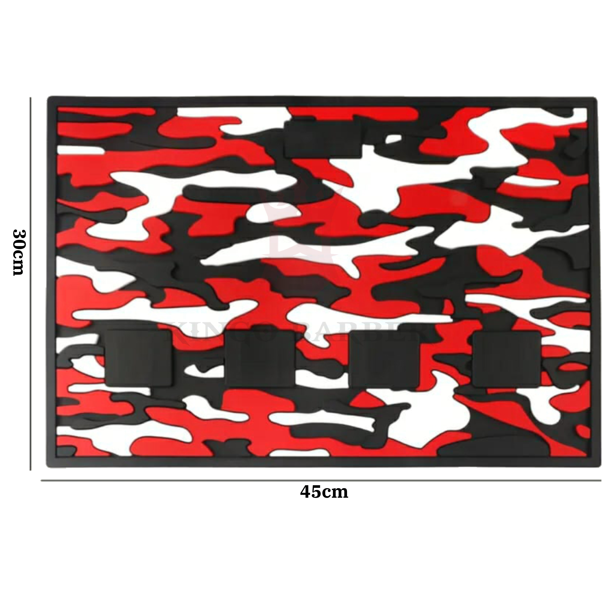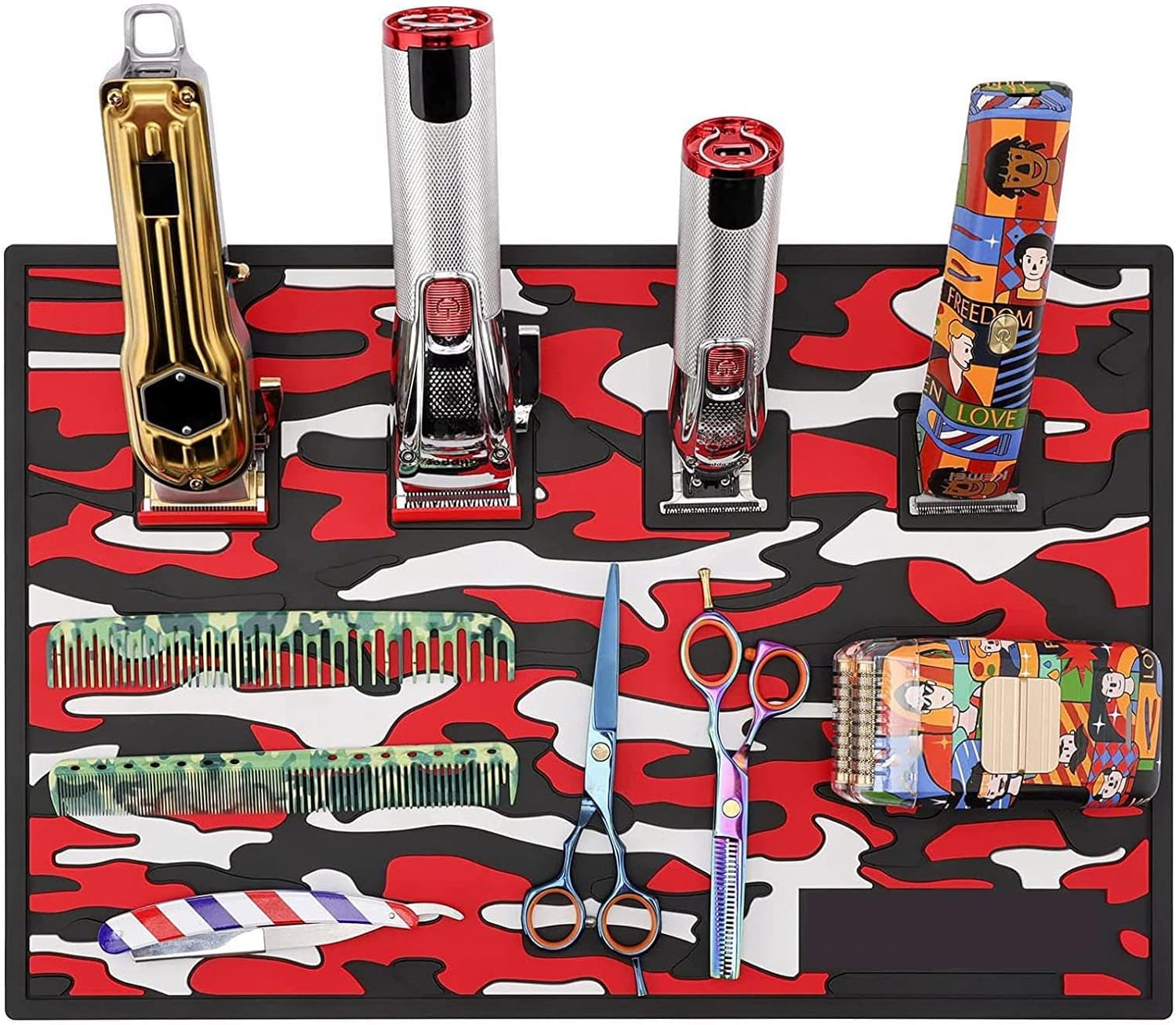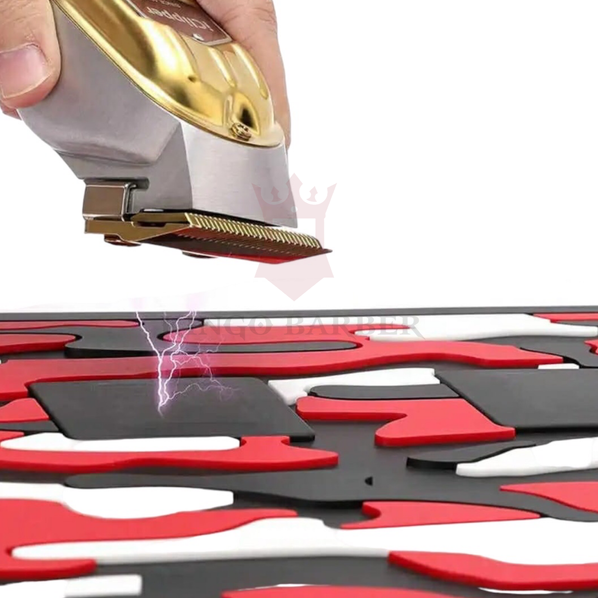 Tapete organizador Antideslizante con 4 puestos Magnéticos, se divide en diferentes áreas de trabajo y puede organizar cepillos, tijeras, peines, máquinas y diferentes productos en él, creando una estación de trabajo elegante y con personalidad. T iene una fuerte adhesión en los imanes para sujetar tus máquinas y evitar que resbalen o deslicen.